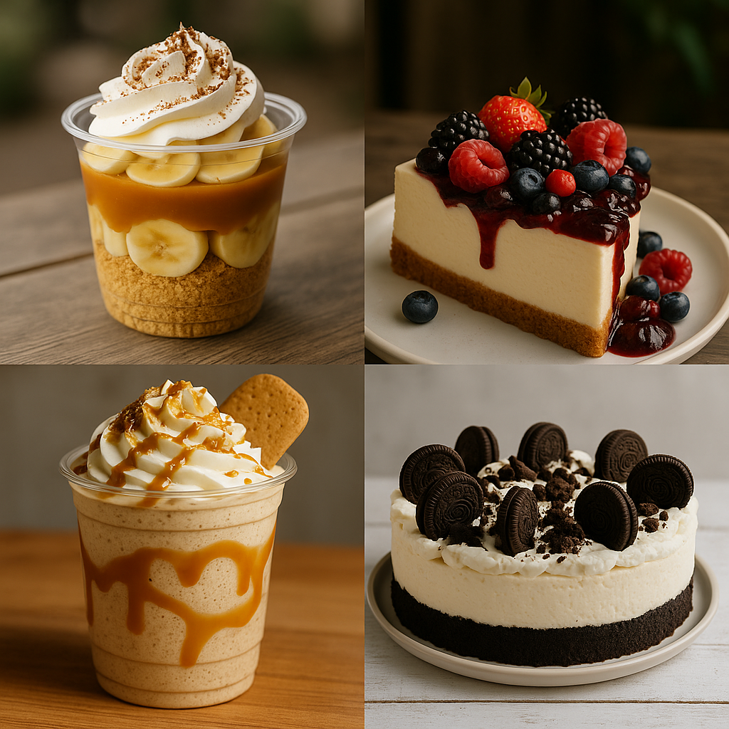 cheesecake de frutos rojos, mousse de chocolate, tiramisú, gelatina mosaico, postres en vaso y mucho más.