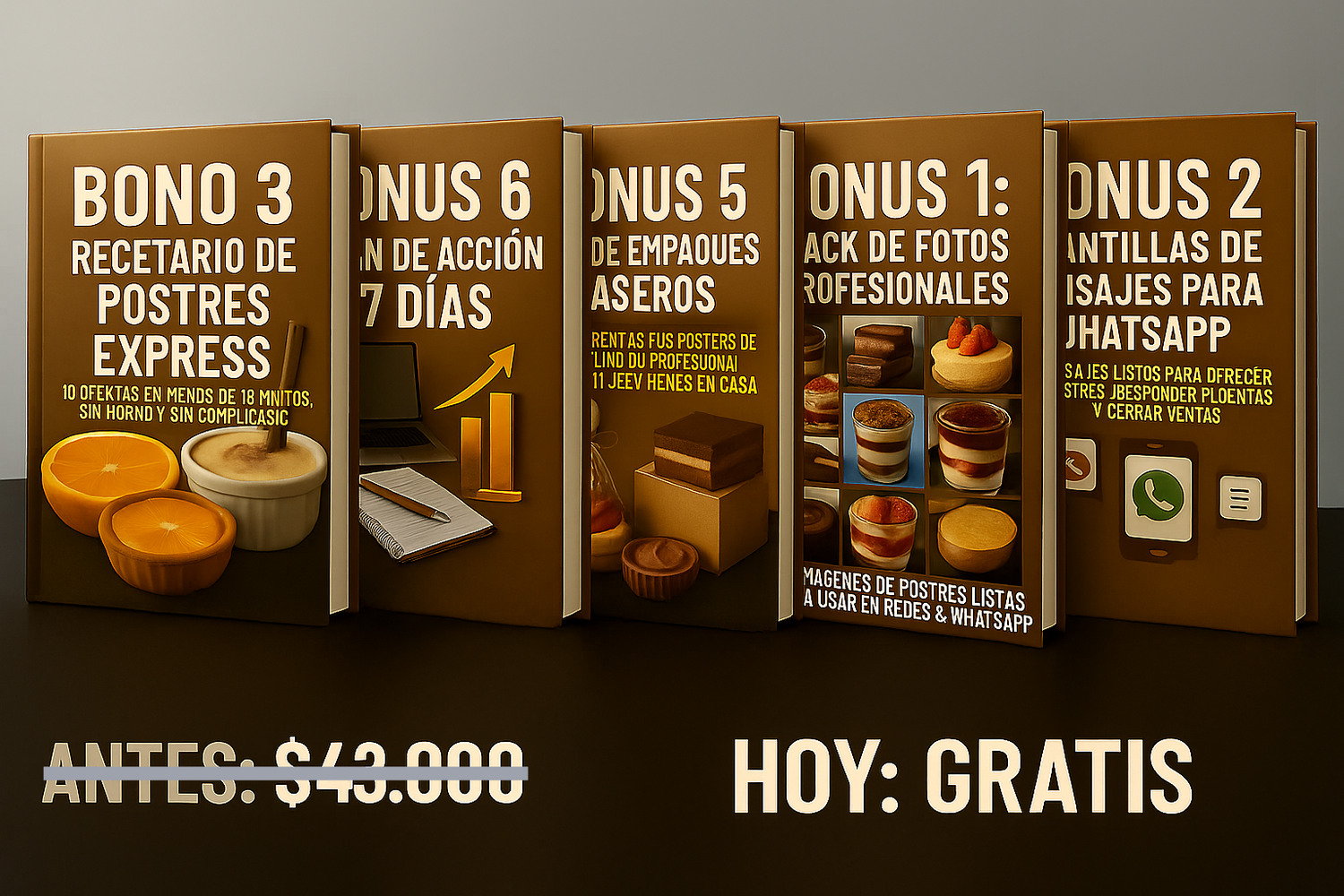 - ✅ Vender tus primeros postres en 7 días, con ayuda del Plan de Acción y los mensajes listos para enviar por WhatsApp.